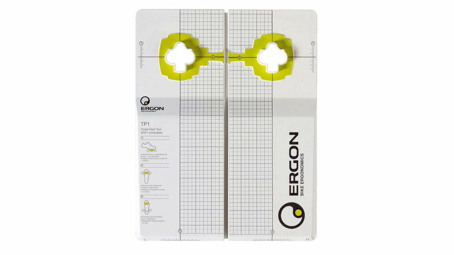 Optimale Ergonomie! Eine genaue Position der Pedalplatten sorgt für die richtige Position der Füße auf dem Pedal. Sie erhöht Leistungsfähigkeit, Gesundheit und Wohlbefinden. Zu spüren sind die Auswirkungen einer ergonomischen Einstellung der Pedalplatten beim Fahren sofort. Das TP1 ist ein Werkzeug, das es ermöglicht, die Pedalplatten präzise am Radschuh auszurichten. Die Position beider Füße zueinander zu beachten, wird mit dem Ergon TP1 um ein Vielfaches erleichtert, eine Feinabstimmung über ein durchdachtes Raster erst möglich. Mit diesem in dieser Form einzigartigen System ist es für Jedermann möglich, die Pedalplatten schnell und genau einzustellen. Aufgrundder profilierten Form können jegliche Radschuhe in beliebiger Größe einfach positioniert werden. Das aus einem technischen Polypropylen gefertigte Tool ist unempfindlich gegen Kratzer. Platzsparende und einfache Handhabung durch praktischen Klappmechanismus. Neben der intuitiv praktischen Anwendbarkeit des TP1 ist das dazugehörige Handbuch wichtiger Bestandteil des Werkzeugs. Hier werden ergonomische Grundlagen, biomechanische Zusammenhänge und die Anwendung des TP1 ausführlich beschrieben. Ein zusätzliches Expertenwissen im Anhang jeden Kapitels nimmt noch stärkeren Bezug auf die performance-steigernde Wirkung einerergonomisch richtigen Tretbewegung auf dem Rad. IF Eurobike Award Winner 2008